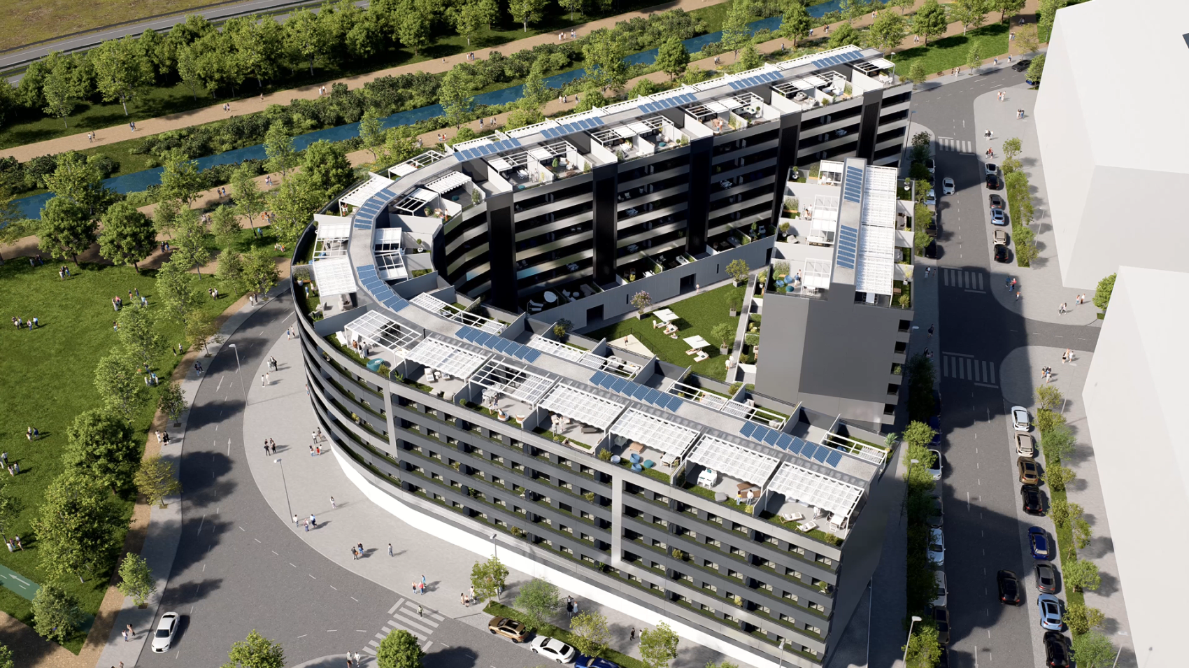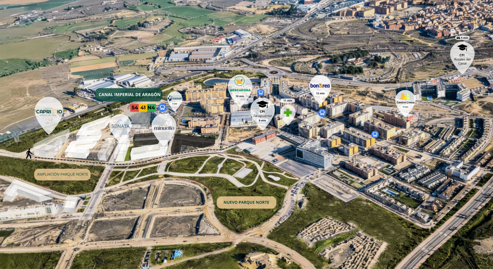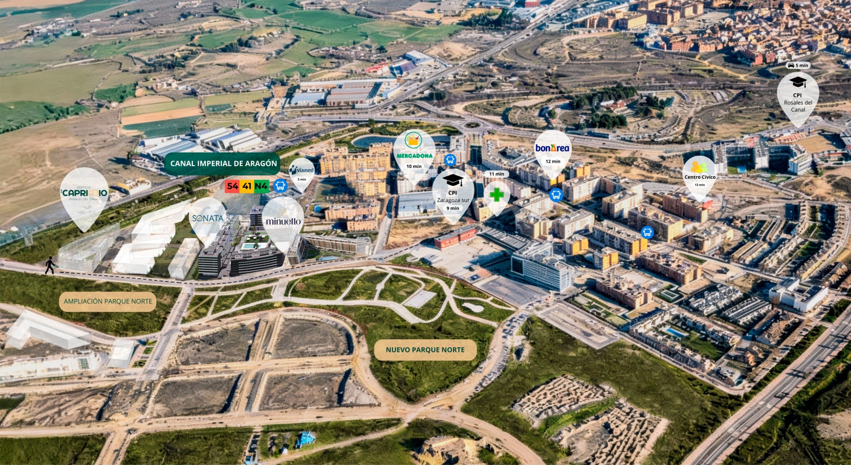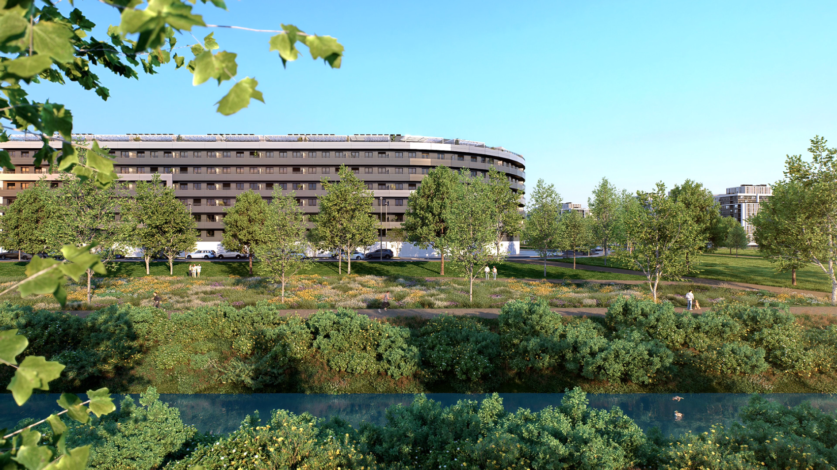 Ubicado frente al Canal Imperial de Aragón, Capriccio ofrece unas vistas espectaculares que convierten cada día en una experiencia diferente. Un lugar ideal para correr, montar en bici, pasear con tu mascota, o simplemente disfrutar de la tranquilidad de la naturaleza.